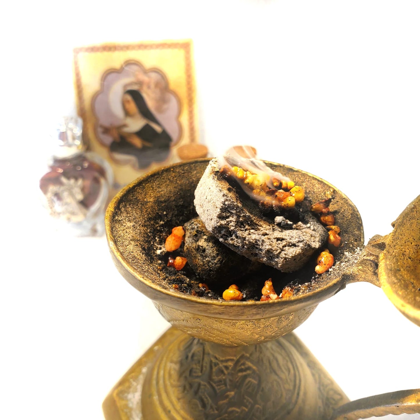 Au village, nous produisons également de l'encens à la rose rose, qui accompagne les messes et les sœurs du monastère avec un parfum de sainteté. En plus de l'encens et des pétales de roses bénies, vous aurez également dans notre coffret dédié à Sainte Rita, de l'huile, de l'eau provenant également de Cascia, ainsi qu'une carte contenant une relique de la Sainte des causes impossibles. Vous avez également la possibilité d'avoir dans votre ensemble un magnifique chapelet en palissandre dont le parfum doux et agréable accompagnera votre méditation des mystères du chapelet.
